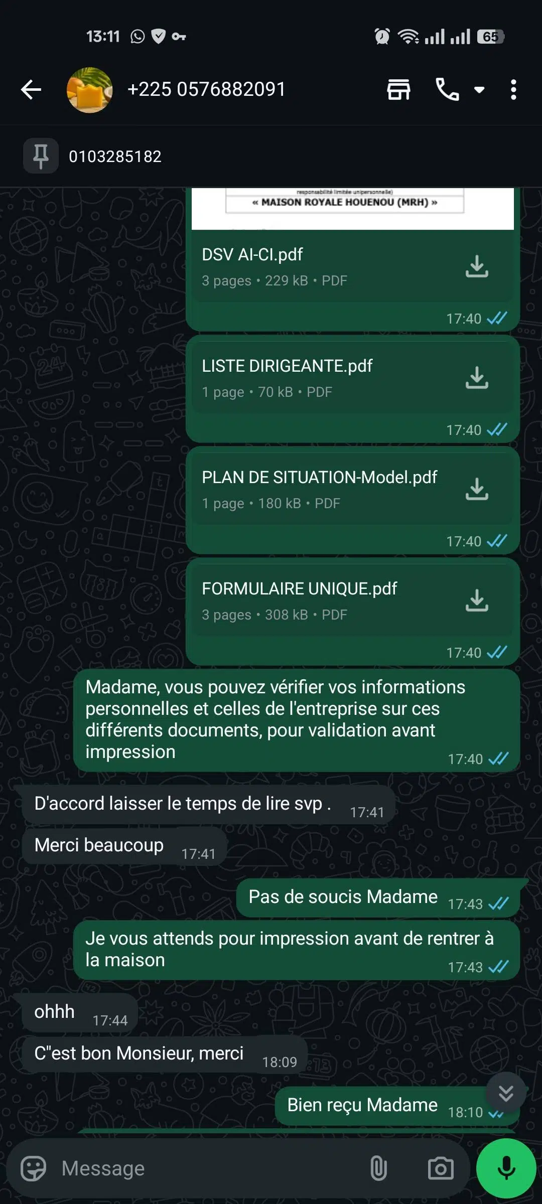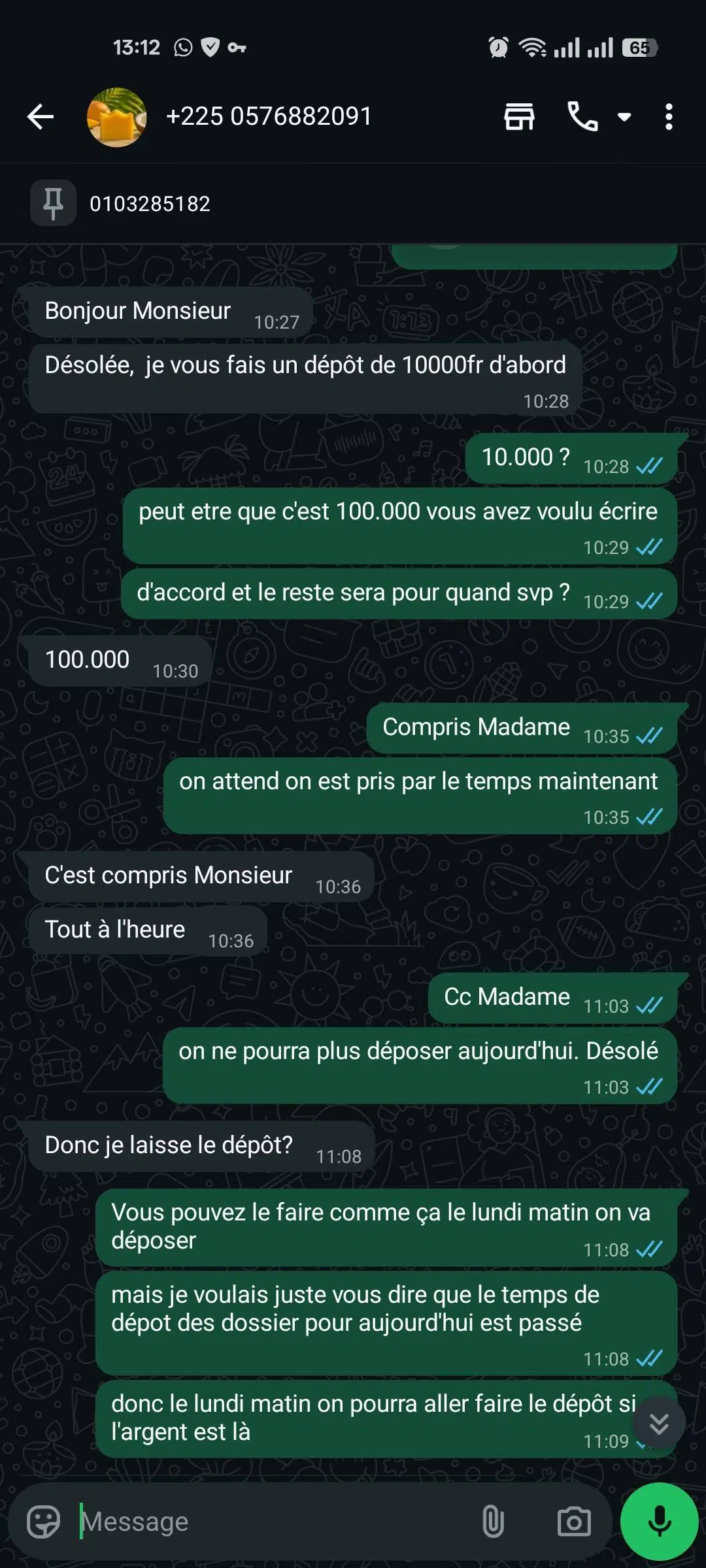 Malheureusement, elle n’a pas pu faire le dépôt à temps et la fermeture de la caisse du CEPICI étant à 11h30, le dépôt a été reporté pour le lundi. Donc le lundi, après le paiement on oubliera le reçu et on va lui transmettre aussi la photo.