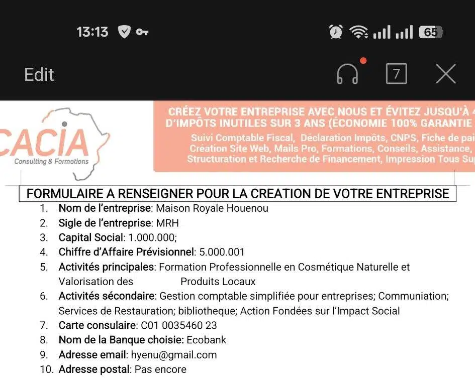 Hier, une nouvelle cliente nous a contacté pour la création de son entreprise, après un long échange de réponses à toutes ses préoccupations et aussi de nos conseils d’experts, elle a fini par valider nos conseils et a décidé de nous faire confiance pour la création de son entreprise.