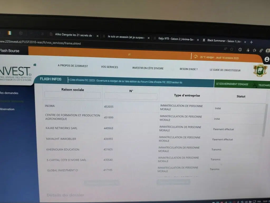 Parce qu’après que le registre de commerce, le certificat d’IDU et l’avis de constitution soient disponibles sur le site 225invest.ci on passe à la sortie de la DFE et pour ça aussi il y a ses durées de travail pour : le plan cadastre, la visite du local (on gère tout même si vous n’avez pas de local